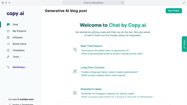 • 4. In seconds, Copy AI generates several versions of creative, engaging, and relevant content. Choose the one you like the most or try again for more suggestions.