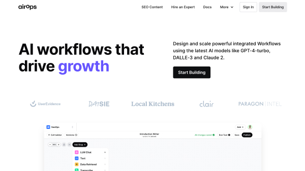 Step into the future with AirOps, a next-generation artificial intelligence software that transforms aerial data into actionable insights. Designed to boost the efficiency of your business operations, this technological marvel offers significant improvements in site safety, optimized workflow, and cost reduction. By integrating machine learning and cloud-based technology, AirOps streamlines inspection, surveying, and mapping processes with utmost accuracy and speed. It's a brilliant tool that brings about a revolution in the way you process, analyze, and leverage aerial data. Let technology uplift your business with AirOps; it's automation at its best, craftily tailored for the skies!